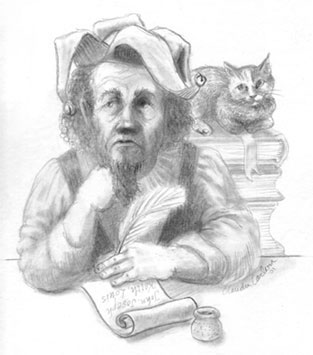 Rumpelstiltskin Keeps Mum (c) 2001 Claudia Carlson Rumplestiltskin Keeps Mum He was able to make hay into ore. He was able to make peasant into queen. He was not able to make rise the rumpled skin between his parenthetic legs. As if he ever needed her insignificant dowry. Amber beads? Her little ring? No, he needed someone to teach the lexicon he knew; a student, a scribe, an heir, this infant son codified in royal flesh. He's keeping mum. Let her ask, his name is buried. The power in names is well documented. Rosetta Stone junkies and the code breakers, all those efforts at making a key turn when he, he was ready to stop turning. Too weary, too lame, his past misquoted and plagiarized, he was now Mr. Anonymous. He had read the scrolls and hieroglyphs. He knew the cliff where the phoenix rose. He picked the herbs a hedgewitch picks. The libraries of Alexandria still burned in his eyes. Let other men tear bindings, pillage language, spread words like fleas. Let women grunt their syllables of forcing new souls to repeat the words of the world. He'd never tell, He's keeping mum. (Claudia Carlson was born in Indiana and raised in college towns all over the U.S. She has worked as a quilt designer, calligrapher, book designer, mapmaker, illustrator, and website designer, from Noho to the MTV towers. Carlson has twice been a participant in the Frost Place poetry workshops. Co-founder with Deborah Atherton of the writing group, Riverwriters, she lives in Manhattan.) |